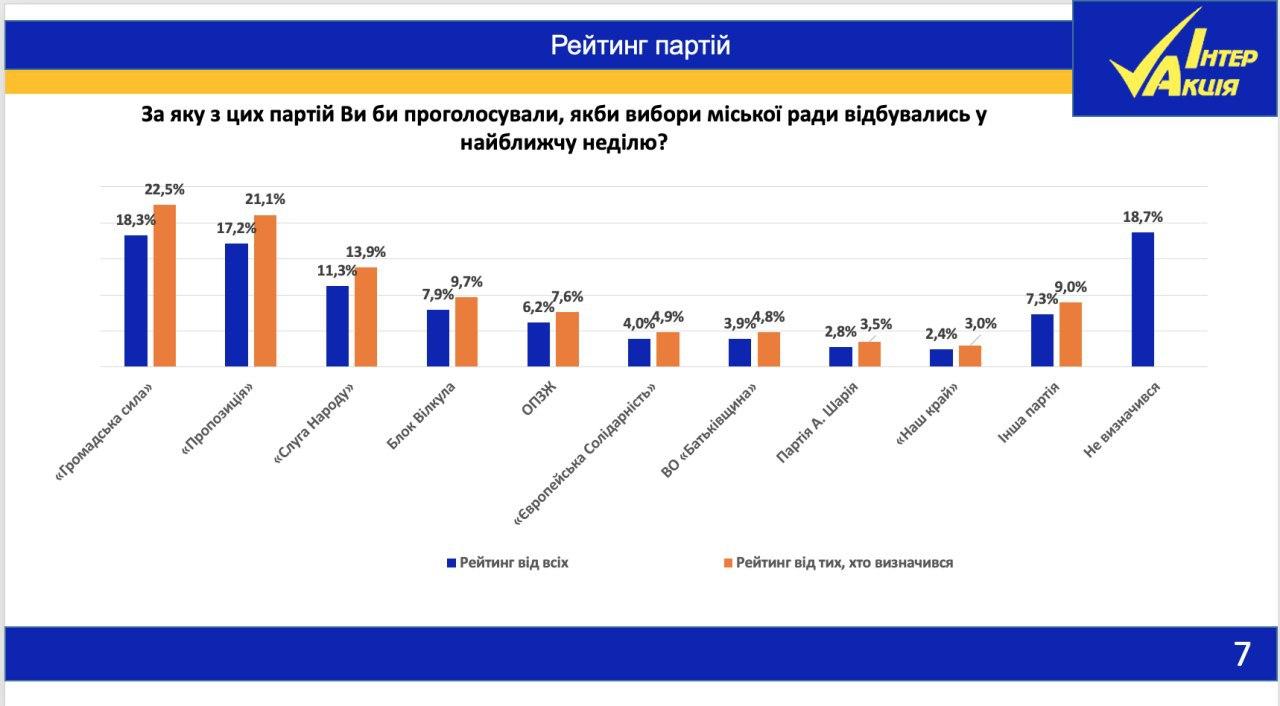 Среди политических партий предпочтения жителей Днепра распределились следующим образом: "Громадська сила" - 22,5%, Пропозиція" - 21,1%, "Слуга народа" - 13,9%, "Блок Вилкула" - 9,7%, ОПЗЖ – 7,6%, "Европейская солидарность" - 4,9%, "Батьківщина" - 4,8%.