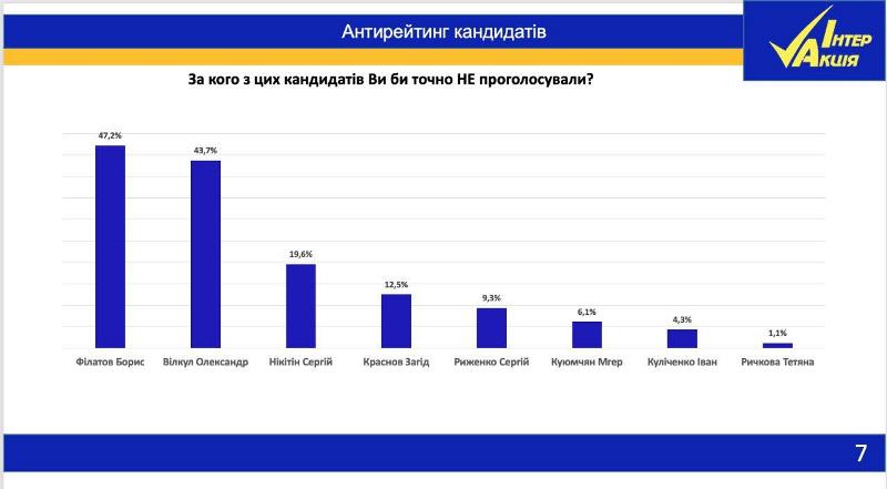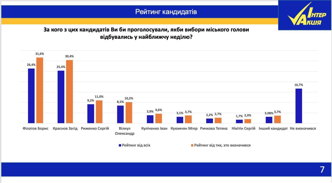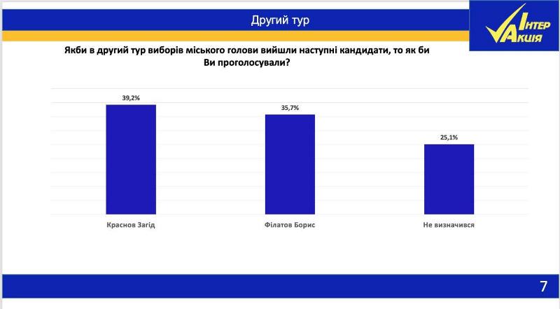 В первом туре мэрских выборов, среди тех, кто определился, результаты таковы: Борис Филатов ("Пропозиція") – 31,6%, Загид Краснов ("Громадська сила") – 30,4%, Сергей Рыженко – 11%,, Александр Вилкул – 10,2%, Иван Куличенко – 4,6%. Во втором туре ситуация кардинально меняется: Загид Краснов – 39,2%, Борис Филатов – 35,7%, не определились – 25,1%.