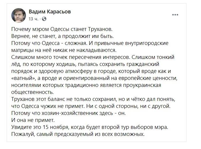 Известный украинский политолог Вадим Карасев в Facebook рассказал, почему мэром Одессы снова станет Геннадий Труханов.