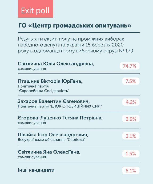 Согласно данным экзит-пола, в 179 округе за Юлию Светличную проголосовали 74,7% тех, кто пришел на участки. Второе место после Светличной заняла Виктория Пташник от "Европейской солидарности", которая получила 7,5%.