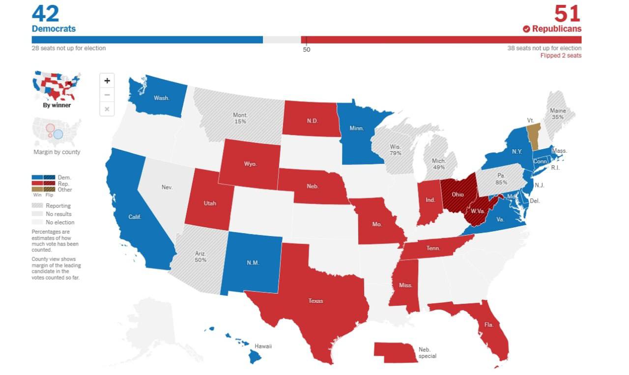Республиканцы получили 51 место в Сенате против 42 у демократов.