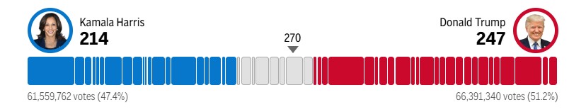 Тем временем продолжается подсчет голосов на президентских выборах. Пока что Дональд Трамп побеждает с 247 голосами избирателей. У Камалы Харрис 214 голосов. Победитель в пяти из семи "шатких" штатов пока не известен, однако пока в них лидирует Трамп.