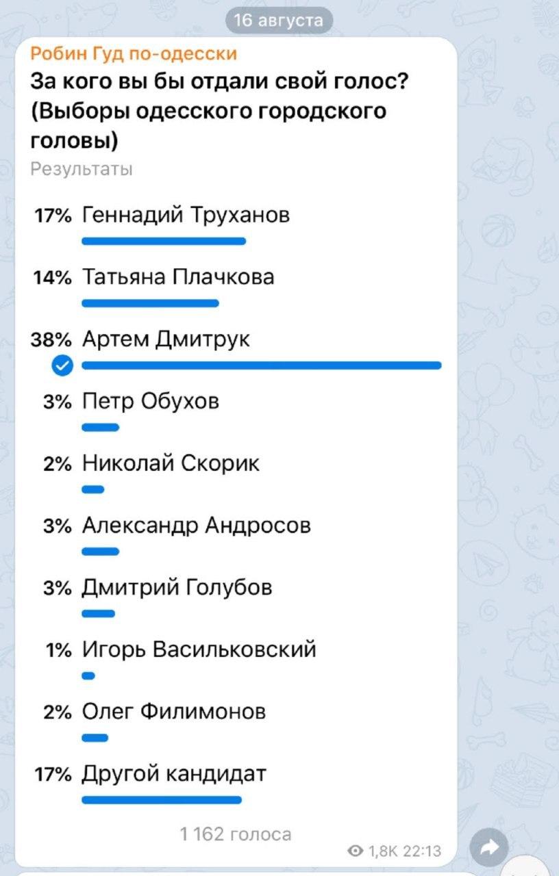 По соцопроса на популярном Telegram-канале в Одессе, Дмитрук уверенно лидирует в мэрской гонке, и является, возможно, единственным на данный момент кандидатом, способным сместить Труханова с должности.