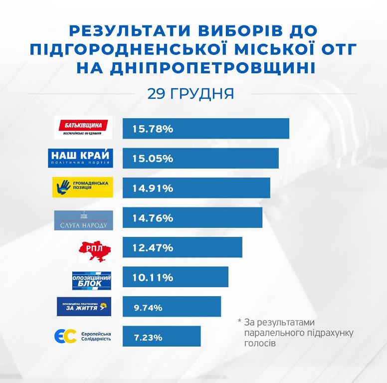 По итогам параллельного подсчета, на первых выборах в Подгороднянской городской ОТГ Днепропетровской области "Наш край" получил 15,05% голосов, войдя в группу лидеров.