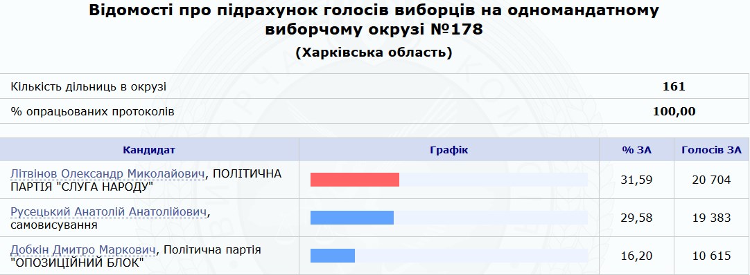 В то же время Дмитрий Добкин проиграл выборы в Харькове на 178 округе. После подсчета голосов он оказался только третьим, набрав 16,2% голосов избирателей. На его округе победил "Слуга народа" Александр Литвинов.