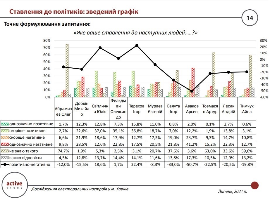 Поставив харьковчанам вопрос об их отношении к политикам, социологи выяснили, что по трем политикам баланс мнений является положительным (т.е. положительное отношение преобладает отрицательное). Лучше всего относятся к И. Терехову (52,6% - положительно, 30,2% - отрицательно), Ю. Светличной (49,8% - положительно, 31,2% - отрицательно) и А. Фельдману (42,4% - положительно, 40,7% - отрицательно). Наиболее негативное отношение харьковчане выразили к И. Балуте (7,8% - положительно, 40,8% - отрицательно) и А. Товмасян (2% - положительно, 24,5% - отрицательно). Более половины респондентов сказали, что не знают таких политиков как А. Абрамичев (74,5%), А. Товмасян (63%) и А. Тымчук (59,6%).