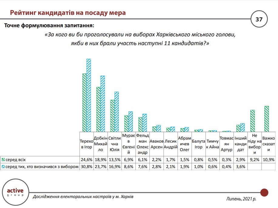 Если бы в выборах Харьковского городского головы участвовали 11 кандидатов, то тройка лидеров рейтинга выглядела бы следующим образом. Первое место занял бы И. Терехов (30,8% среди тех, кто определился), второе должен М. Добкин (23,7%), а третье - Ю. Светличная (16,9%). Е. Мураев и А. Фельдман имели бы по 8,7% и 7,6% соответственно. Остальные кандидаты имели бы результат в пределах погрешности.