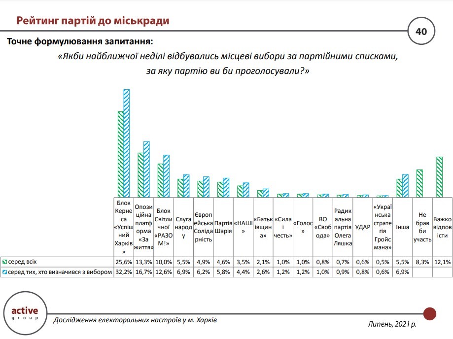 Опрос проводился компанией "Active Group" 17-19 июля 2021 методом индивидуальных интервью "face-to-face". Генеральная совокупность: мужчины и женщины в возрасте от 18 лет, проживающих в г. Харьков. Всего опрошено 1210 респондентов. Выборка двухступенчатая репрезентативна по полу и возрасту. Погрешность при доверительной вероятности 0,95 не превышает 2,9%.