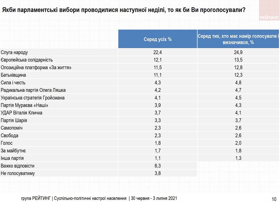 Опрос проведен социологической группой "Рейтинг" в течение 30 июня - 3 июля 2021, среди населения Украины в возрасте от 18 лет и старше во всех областях, кроме временно оккупированных территорий Крыма и Донбасса. Выборка репрезентативна по возрасту, полу и типу поселения. Метод опроса: телефонные интервью с использованием компьютера, на основе случайной выборки мобильных телефонных номеров.