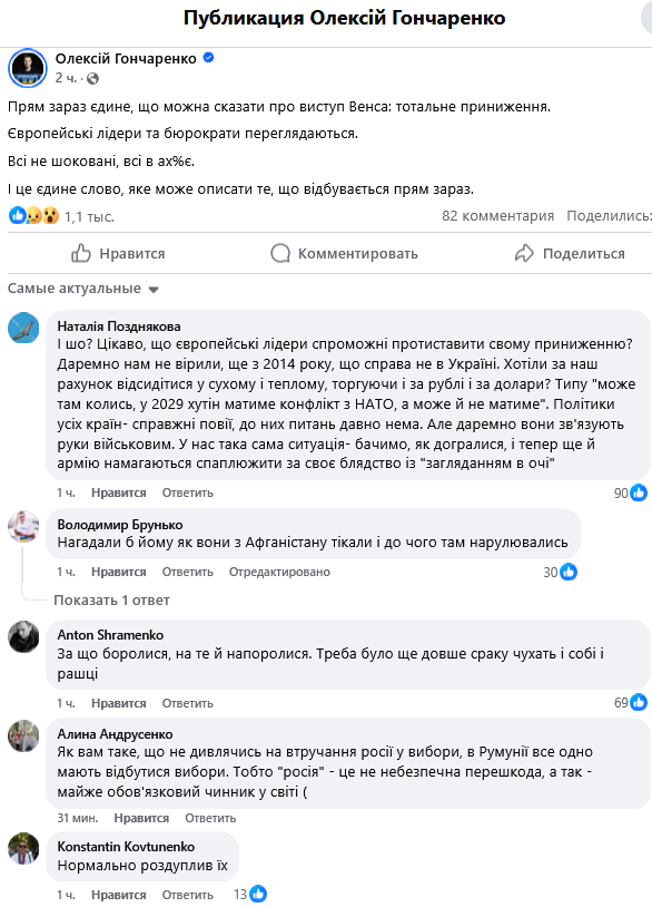 Также нардеп отметил, что в своей речи Вэнс ничего не сказал о войне и Украине, что является плохим звонком.