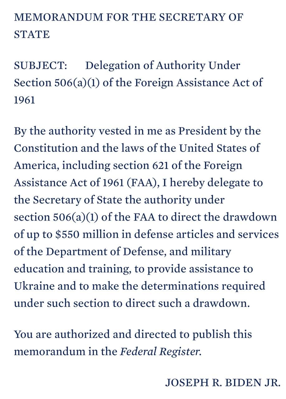 "В соответствии с полномочиями, предоставленными мне как Президенту Конституцией и законами Соединенных Штатов Америки, включая раздел 621 Закона об иностранной помощи 1961 года (FAA), я делегирую Государственному секретарю полномочия в соответствии с разделом 506(а). )(1) Федерального управления гражданской авиации распорядиться о выделении до 550 миллионов долларов на оборонные товары и услуги Министерства обороны... Вы уполномочены и обязаны опубликовать этот меморандум в Федеральном реестре", - говорится в сообщении.