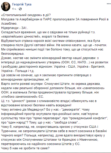 "Стокгольмский синдром" в действии? Молдова и Азербайджан в ПАСЕ проголосовали за возвращение России в Ассамблею. Нидерланды - ЗА! .. Создается впечатление, что мы являемся свидетелями не только разрушения т.н. "Европейских ценностей", морали и безопасности", - прокомментировал он возвращения России в ПАСЕ.