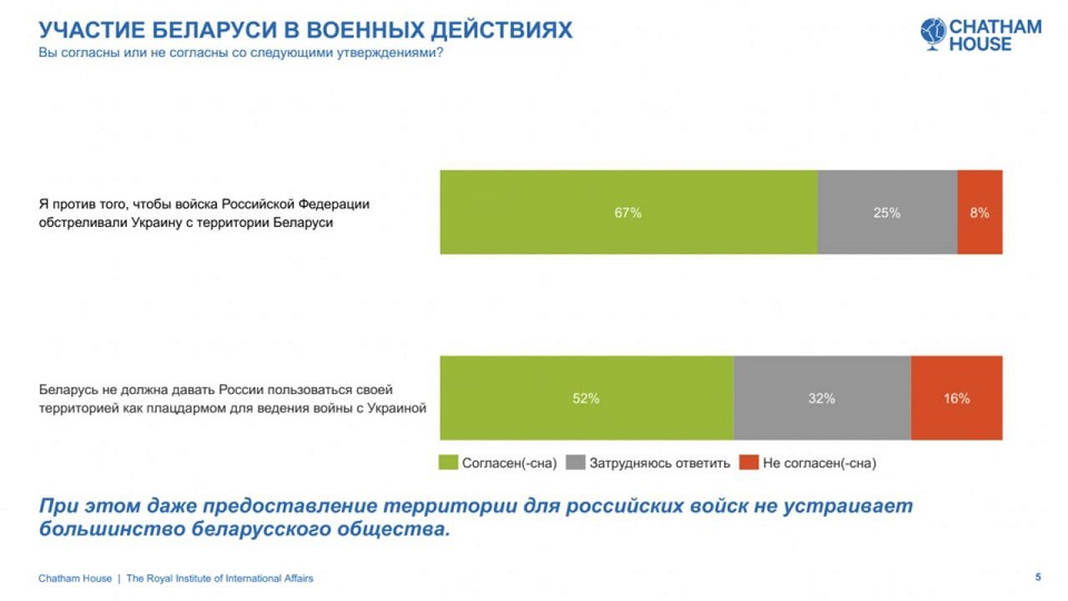 "Chatham House опросил 896 респондентов с 5 по 14 марта 2022. Выборка соответствует структуре городского населения Беларуси и скорректирована по полу, возрасту, размеру населенных пунктов и уровню образования.