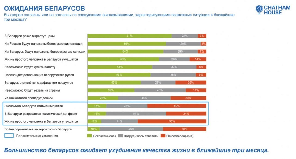 Также по результатам опроса 60% беларусов ожидает ухудшения условий жизни в связи с военным вторжением России в Украину.