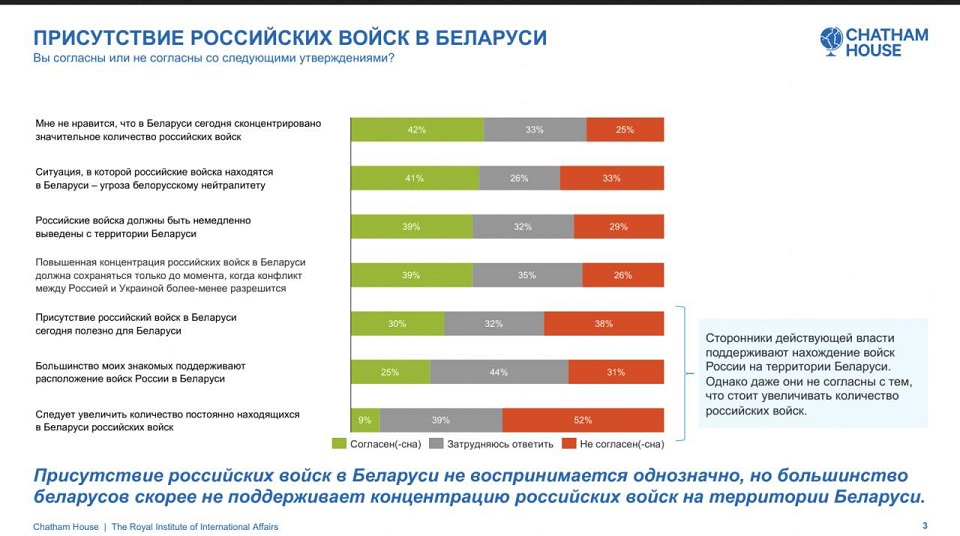 Почти опрошенных беларусов выступают за немедленный вывод войск РФ с территории страны.