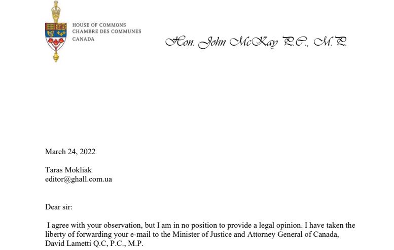 "Я взял на себя право перенаправить ваше письмо Министру юстиции и Генеральному прокурору Канады", – подытожил Джон МакКей.