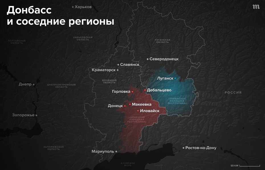 Загвоздка состоит в том, что в "конституциях" самопровозглашенных республик их границами являются административные границы Донецкой и Луганской областей. Однако, по итогам боевых действий в 2014 – 2015 году, значительная часть территорий этих областей оказалась и остается до сих пор под контролем Киева.