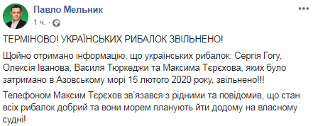 "По телефону Максим Терехов связался с родными и сообщил, что состояние всех рыбаков хорошее и они морем планируют идти домой на собственном судне", – сообщил нардеп.