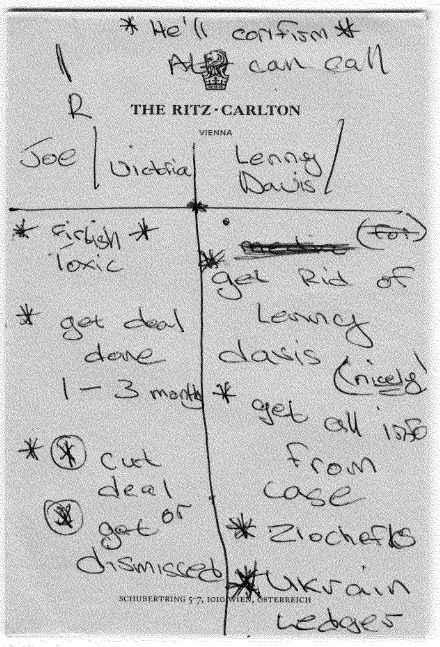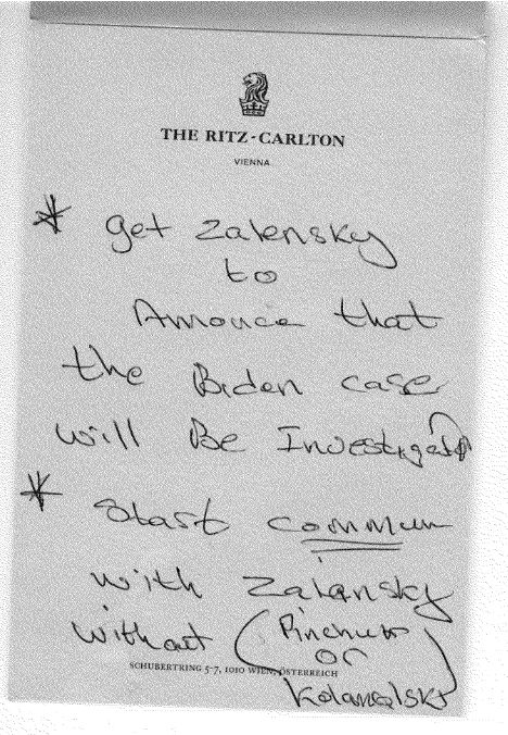 В частности, Парнас предоставил заметки, сделанные на листах, которые выдают в отеле Ritz-Carlton в Вене, где есть такие слова: "заставь Зеленского сказать, что дело Байдена будут расследовать", "наладь общение с Зеленским без (Пинчука и Коломойского)".