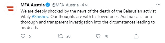 "Соединенные Штаты глубоко опечалены смертью белорусского активиста Виталия Шишова в Киеве, и мы выражаем глубокие соболезнования его близким. Его смерть произошла на фоне неприемлемой белорусской расправы с гражданским обществом, и мы надеемся на полное и тщательное расследование украинской властью и установление причин и обстоятельств", – написали представители американского посольства.
