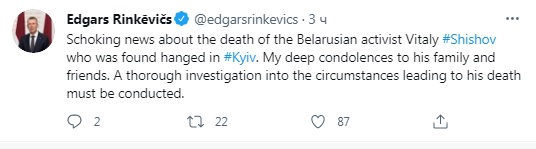 К ним также присоединились некоторые из европейских коллег. В частности глава МИД Латвии Эдгар Ринкевич тоже выразил соболезнования семье и друзьям Шишова в связи с "шокирующими новостями" о смерти белорусского активиста.