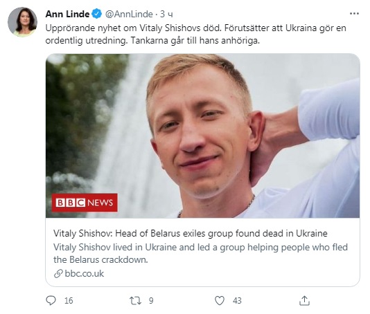 "Шокирующая новость о смерти белорусского активиста Виталия Шишова, найденного повешенным в Киеве. Мои глубокие соболезнования его семье и друзьям. Необходимо провести тщательное расследование обстоятельств его смерти", – написал Ринкевич в Twitter.