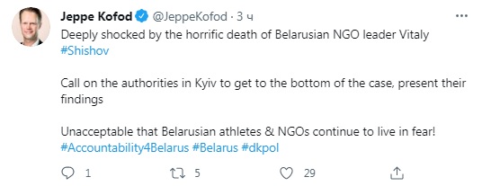 "Призываю власть в Киеве докопаться до сути дела и представить результаты. Неприемлемо, что белорусские атлеты и неправительственные организации продолжают жить в страхе", - подчеркнул Кофод.