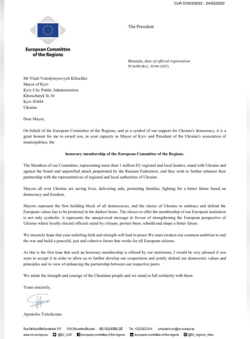 Также, по его словам, в официальном письме Европейский комитет регионов отметил смелость всех украинских городских голов, которые по всей стране спасают жизнь, доставляют помощь людям, защищают семьи, борются за лучшее будущее, основанное на демократии и свободе.