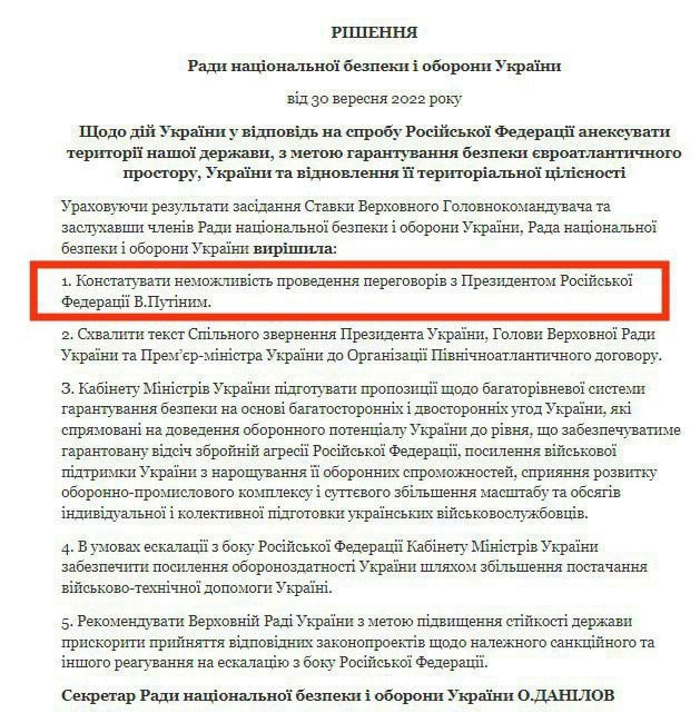 В документе говорится, что по результатам заседания Ставки Верховного Главнокомандующего и членов Совета национальной безопасности и обороны Украины, СНБО решил, что Киев не будет проводить никаких переговоров с Путиным.