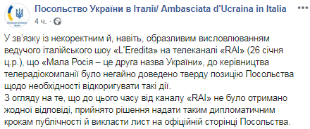 На итальянском телеканале RAI ведущий одного из шоу заявил, что "малая Россия - это второе название Украины".