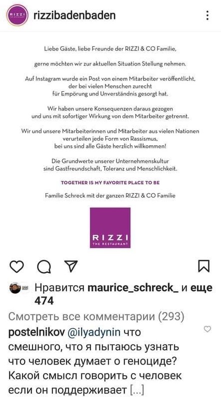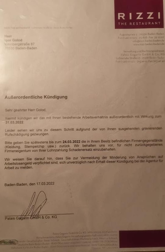 "Война России против независимой Украины добралась и до мирного Баден-Бадена в Германии. Меня уволили из известного ресторана #rizzibadenbaden за мирный протест против агрессии России в Украине. А именно - за антивоенные посты в социальных сетях. По мнению руководства, они наносят репутационный ущерб ресторану. Якобы русскоговорящие люди не хотят приходить в ресторан, потому что их сотрудник поддерживает Украину", - заявил Игорь Голод.