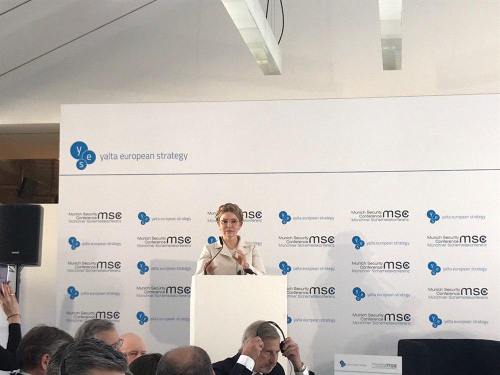 Тимошенко выступила на мероприятии первой. Она начала с того, что на встрече со студентами одного из высших учебных заведений 80% сказали, что хотят уехать из страны.