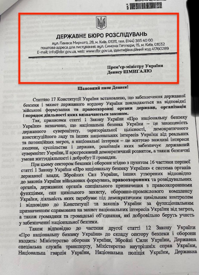 "Прошу дополнить перечень субъектов, которым может выплачиваться дополнительное вознаграждение согласно постановлению Кабинета Министров Украины от 28.02.2022 номер 168 "Вопросы некоторых выплат военнослужащим, лицам рядового и начальствующего состава, полицейским и их семьям во время действия военного положения", лицами рядового и начальствующего состава Государственного бюро расследований", - говорится в письме.