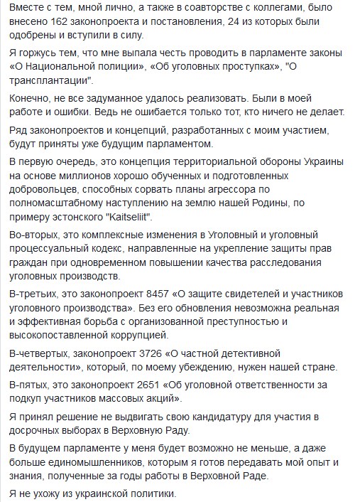 "Я принял решение не выдвигать свою кандидатуру для участия в досрочных выборах в Верховную Раду. В будущем парламенте у меня будет возможно не меньше, а даже больше единомышленников, которым я готов передавать мой опыт и знания, полученные за годы работы в Верховной Раде", - написал он.