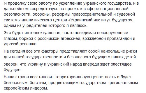 "Я продолжу свою работу по укреплению украинского государства, и в дальнейшем сосредоточусь на проектах в сфере национальной безопасности, обороны, реформы правоохранительной и судебной системы аналитического центра "Украинский институт будущего", одним из учредителей которого я являюсь. Это будет интеллектуальная, часто невидимая невооруженным глазом, борьба с российской агрессией, враждебной пропагандой и угрозой реванша", - отметил он.