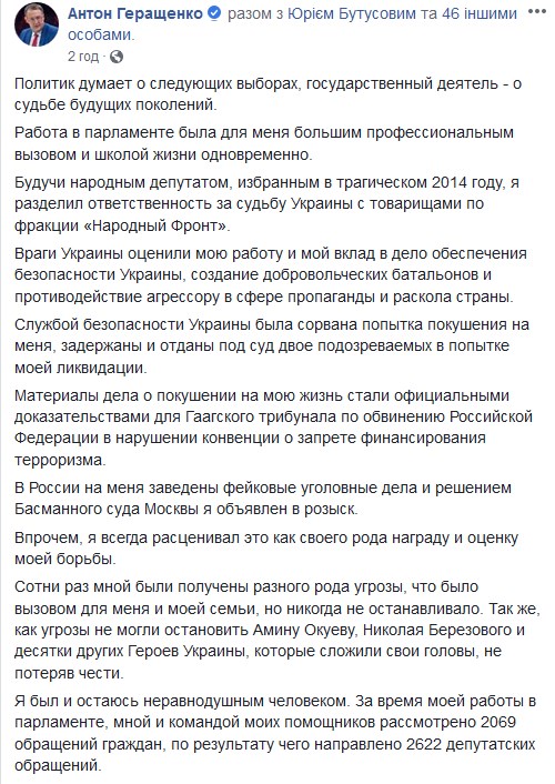 При этом Геращенко заявил, что не уходит из украинской политики.