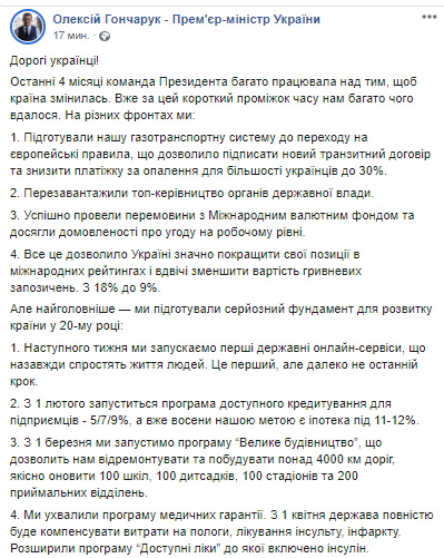 В своем сообщении Гончарук перечислил пункты, в которых описал успехи работы своей команды, а также обозначил, что именно правительство планировало сделать в ближайшее время.