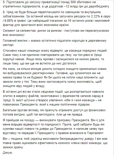 "По нашей команде скажу откровенно: это команда порядочных людей. Именно поэтому я не прекращу повторять этот тезис: на топ-уровне в правительстве коррупции нет. Если какие-то проявления и остались на нижних уровнях, то лишь потому, что мы еще не успели до них добраться", - пишет он.