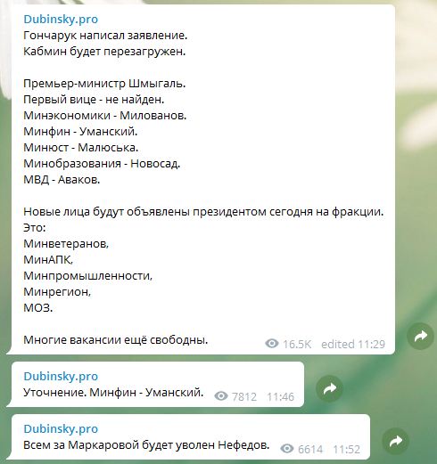 "Гончарук написал заявление. Кабмин будет перезагружен. Премьер-министр Шмыгаль. Первый вице - не найден. Минэкономики - Милованов. Минфин - Уманский. Минюст - Малюська. Минобразования - Новосад. МВД - Аваков", - написал он.