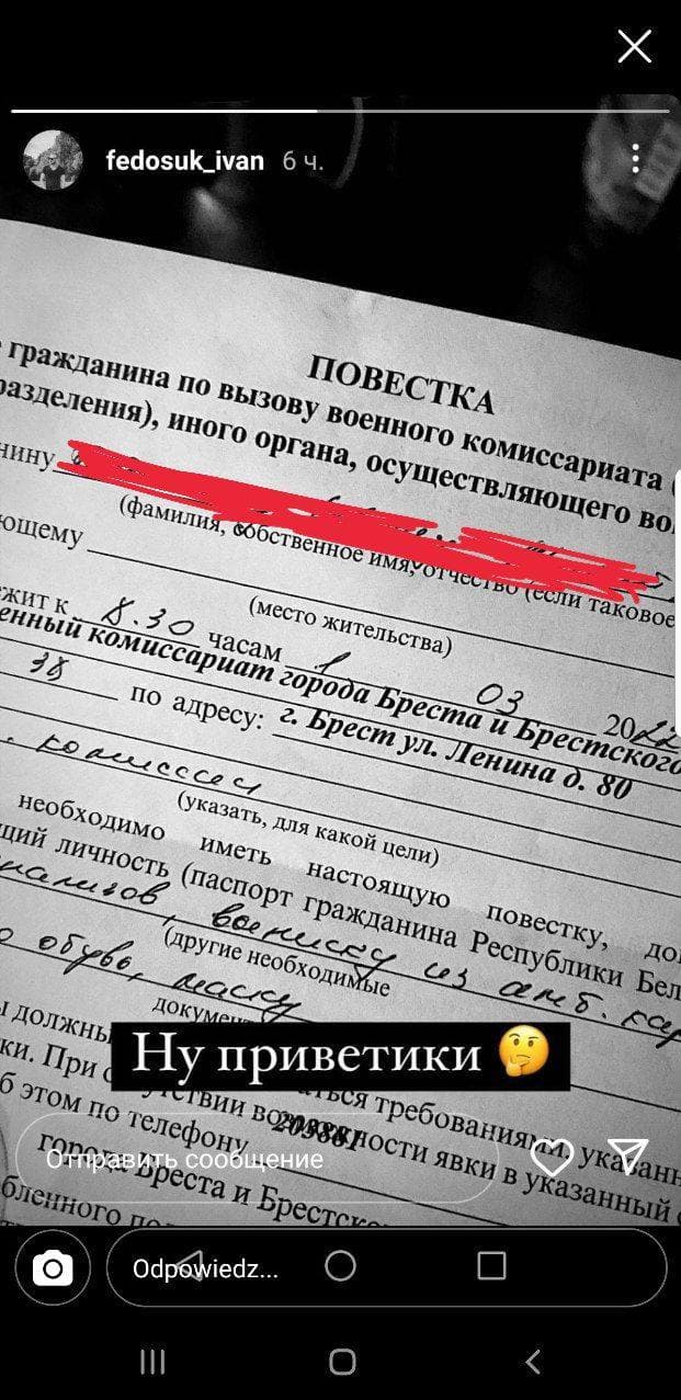 Фото повестки опубликовал белорусский пользователь соцсети Instagram.