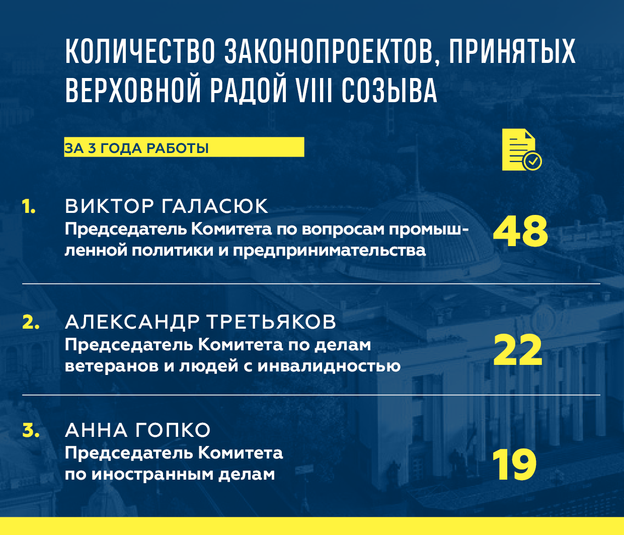 В первые три года работы парламента председатель Комитета ВР по вопросам промышленной политики и предпринимательства Виктор Галасюк стал инициатором 48 принятых законопроектов. Председатель Комитета по делам ветеранов и лиц с инвалидностью Александр Третьяков инициировал 22 принятых законопроекты. Председатель Комитета по иностранным делам Анна Гопко инициировала 19 принятых законопроектов.