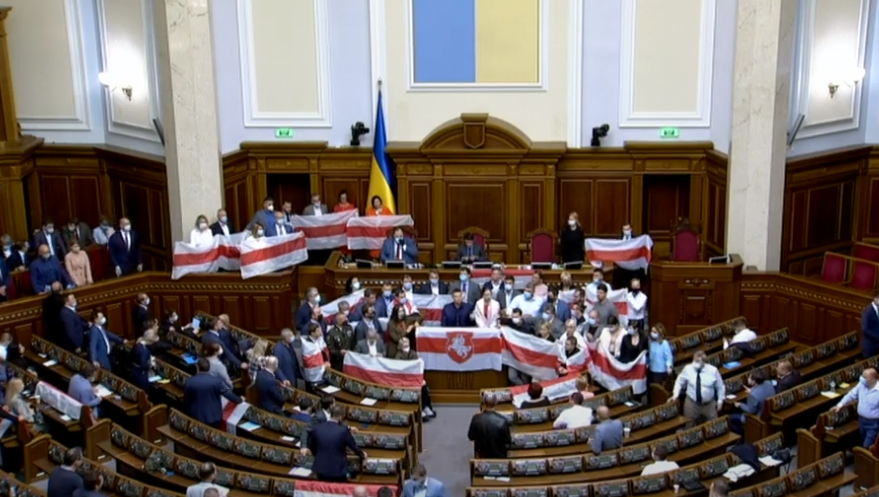 В пятницу, 4 сентября, в Верховной Раде Украины группа народных депутатов с красно-белыми флагами в руках выступили с заявлением в поддержку свободных выборов в Беларуси.