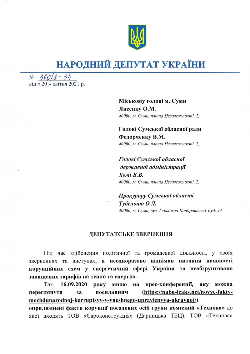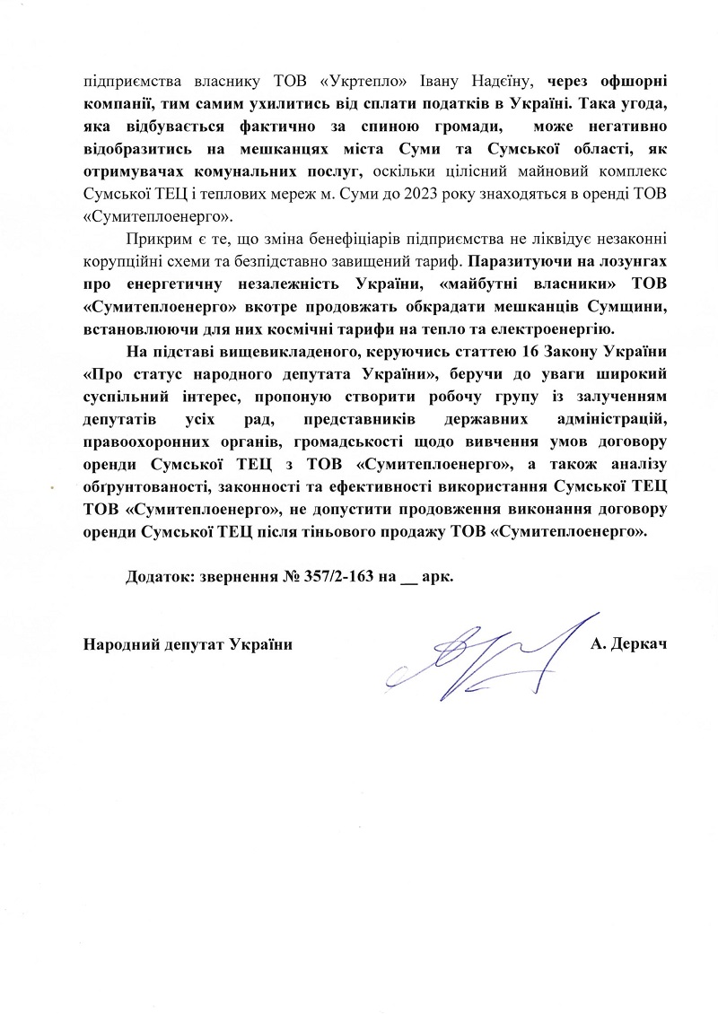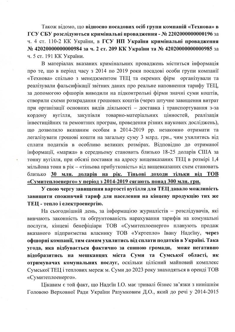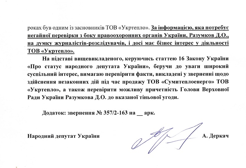 "По информации журналистов-расследователей, "Сумытеплоэнерго" планируют продать собственнику ООО "Укртепло" Ивану Надеину (по совместительству – президенту самого народного футбольного клуба "Верес"). Способ продажи избран "народный" – через офшоры, чтобы налоги не платить. Надеин имеет длительные бизнес связи с нынешним главой Рады Разумковым, который в 2014–2015 был одним из соучредителей ООО "Укрптепло", а по мнению журналистов-расследователей, до сих пор имеет бизнес интерес в деятельности компании", – сообщает Деркач.