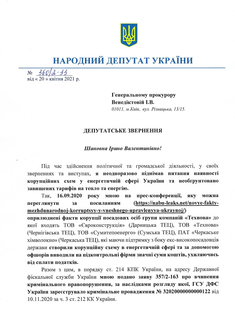 Нардеп связывает продажу компании с попыткой уйти от ответственности руководства группы компаний "Технова", на котором висят уголовные дела СБУ, Нацполиции и ГФС.