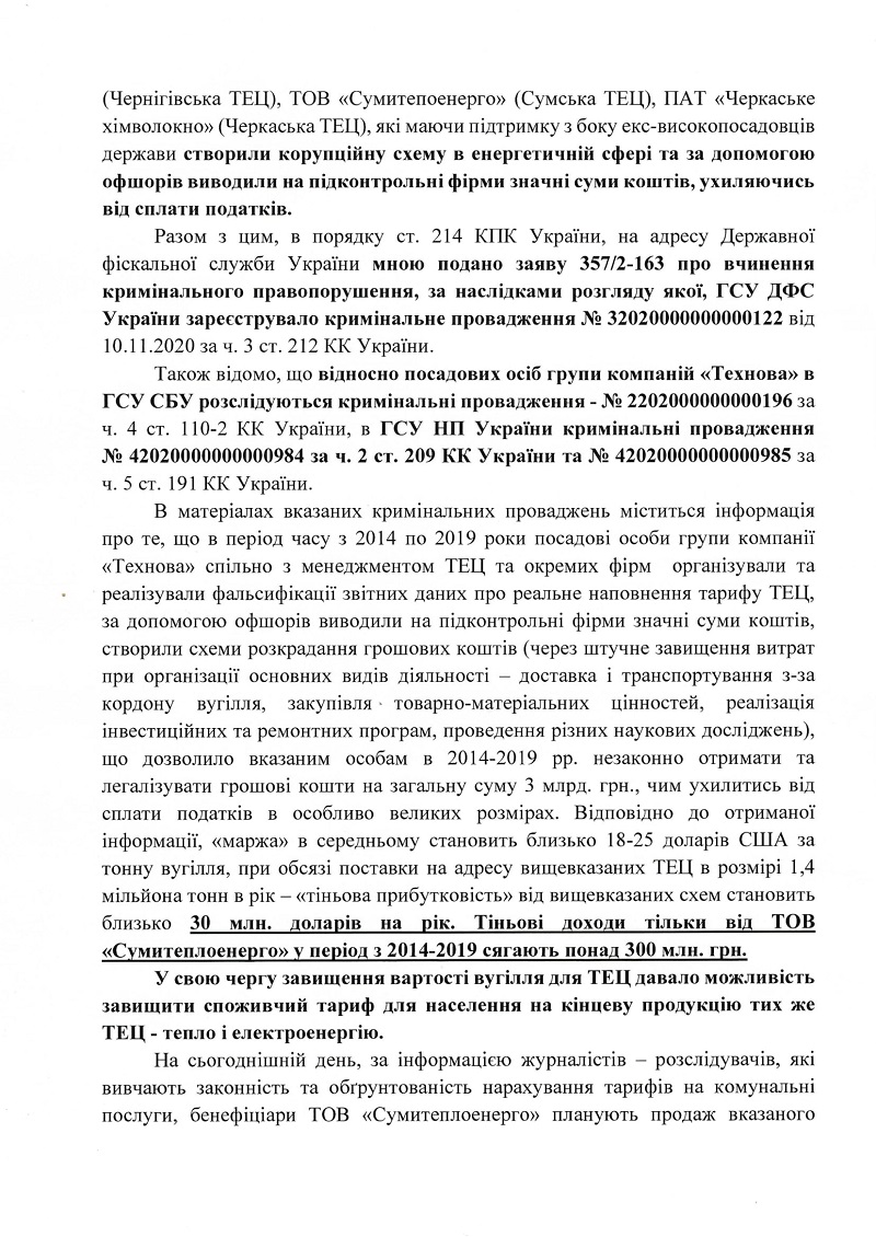 По словам нардепа, "Сумытеплоэнерго", за 5 лет получила прибыль в 300 млн гривен от теневых схем на Сумской ТЭЦ, которую она арендует.