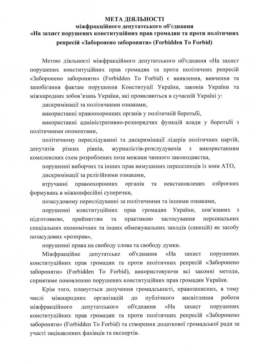Деркач отметил, что в объединение вошло 30 представителей разных фракций и депутатских групп. "Запрещено запрещать" (Forbidden to Forbid), используя все доступные законные методы, будет бороться за восстановление конституционных прав граждан Украины.