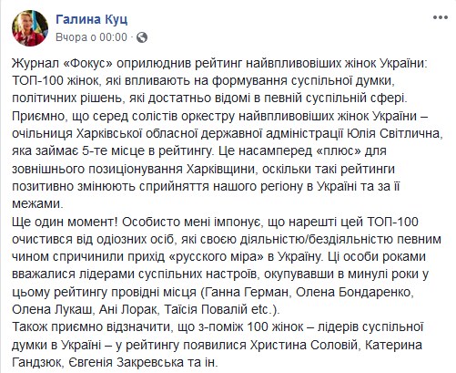 Тем временем политолог Галина Куц считает, что глава Харьковской области закономерно попала в топ-5 рейтинга. Она также отмечает особую важность столь высокого результата и самого рейтингового оценивания.