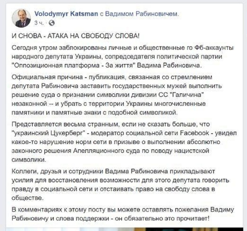 Обратим внимание, что это уже не первое блокирование Facebook-страниц Вадима Рабиновича.
