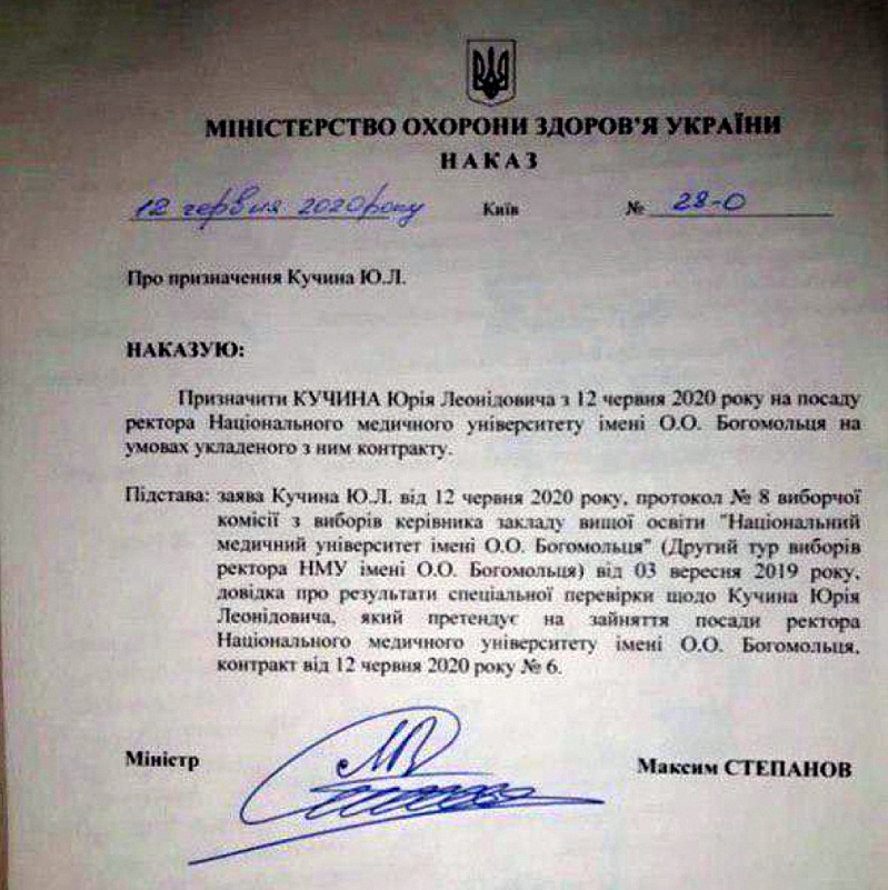 Министр здравоохранения Украины Максим Степанов подписал приказ о назначении нового ректора Национального медицинского университета им. Богомольца, несмотря на действующий запрет Печерского районного суда Киева.