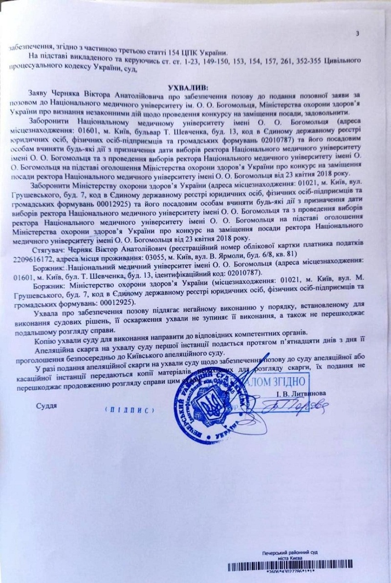 Однако еще 27 августа 2019 года Печерский районный суд Киева своим решением запретил Минздраву и его должностным лицам утверждать ректора университета, тем более что в настоящее время вопрос о вакантной должности ректора рассматривается в Кассационном гражданском суде.